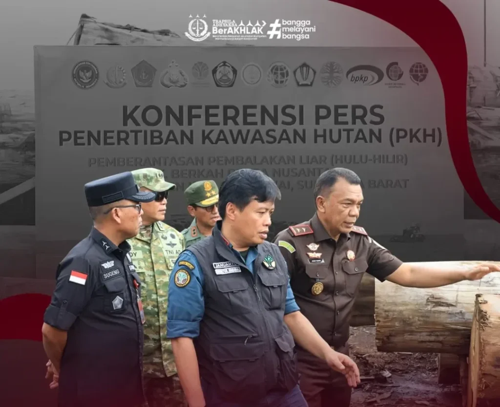 GRESIK, Senin 01 Desember 2025 – Jajaran pejabat tinggi dari Kementerian Lingkungan Hidup dan Kehutanan (KLHK), Kejaksaan RI, TNI, dan Kepolisian yang tergabung dalam Satuan Tugas Penertiban Kawasan Hutan (Satgas PKH) menggelar konferensi pers di Pelabuhan Gresik, Jawa Timur , Senin (1/12/2025).