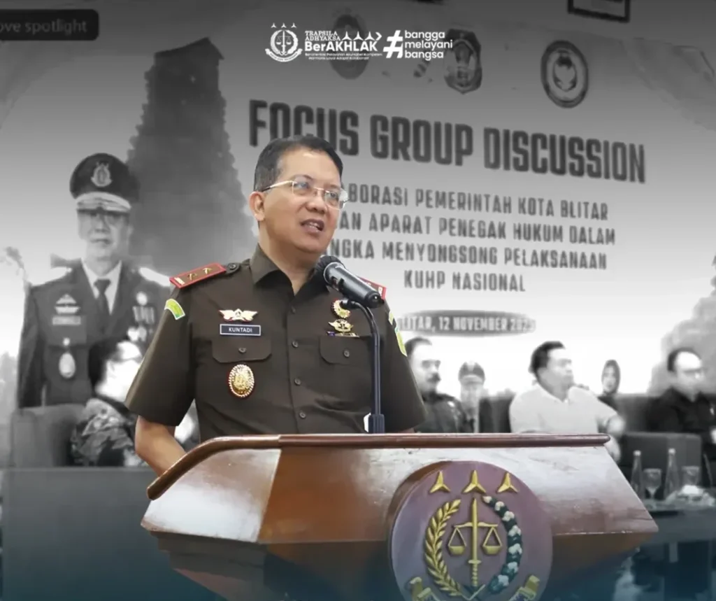 SURABAYA, Kamis 13 November 2025 – Kepala Kejaksaan Tinggi Jawa Timur, Dr. Kuntadi, S.H., M.H., menjadi keynote speaker secara daring dalam kegiatan Focus Group Discussion (FGD) yang diselenggarakan oleh Kejaksaan Negeri Blitar bersama Pemerintah Kota Blitar, Rabu (12/11/2025).